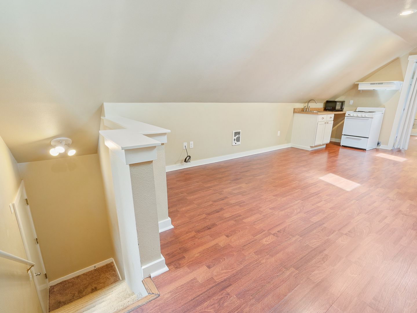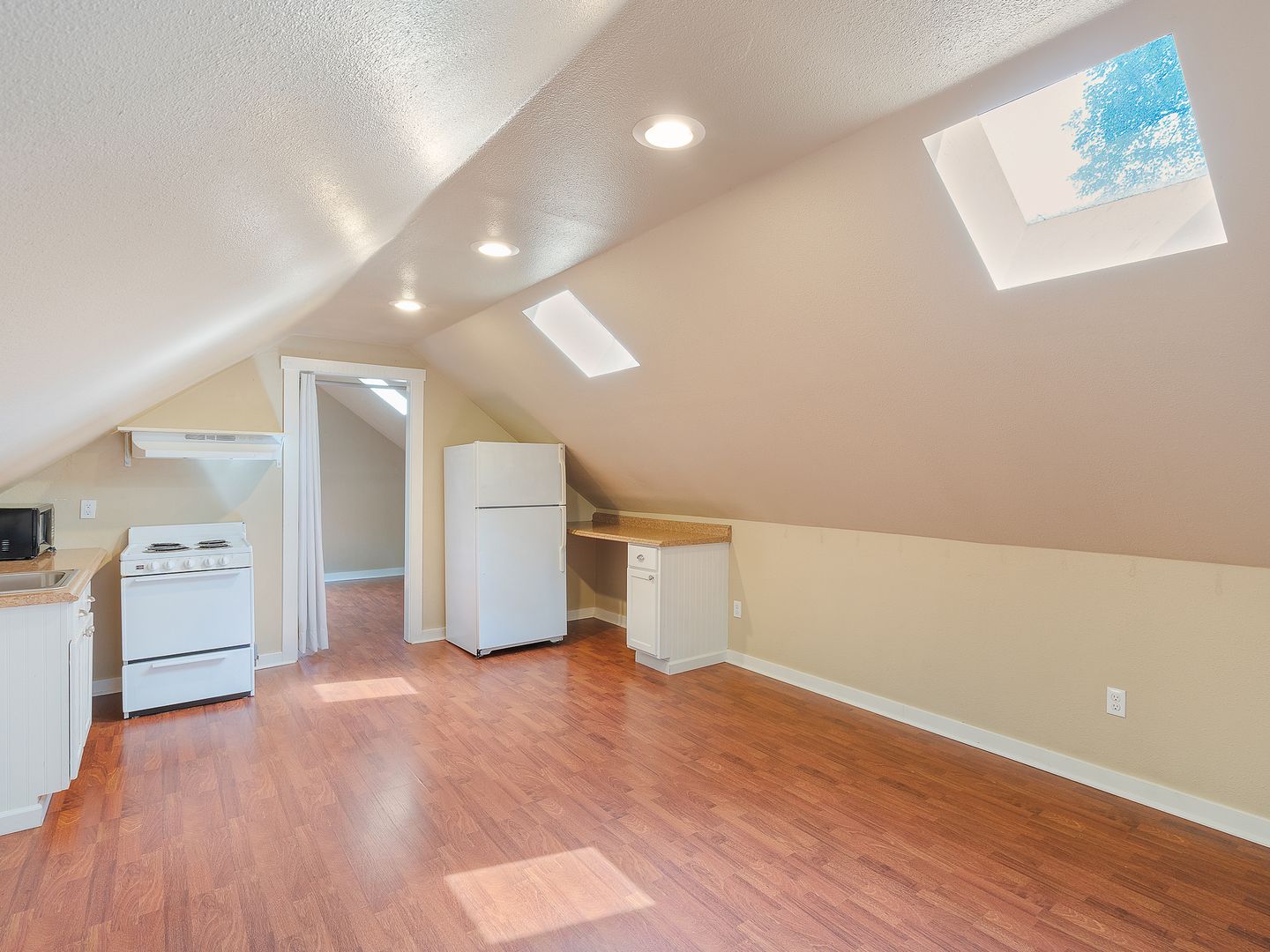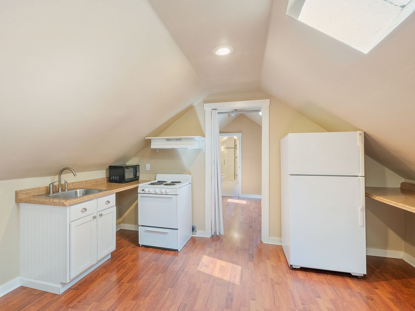 MOVE IN SPECIAL! 1/2 Off First Month's Rent!! Spacious & Updated unit in tri-plex with 1 bedroom and 1 bathroom located in the Alphabet District! Open great-room floorplan with beautiful hardwood flooring. Kitchen includes refrigerator, stove and microwave. Bedroom has large closet and skylight to allow bright natural light in. Bathroom has shower and lots of storage space. Parking spot in driveway. $100 flat fee for utilities. Shared washers and dryers available as well. NO Pets. NO smoking. Drive by and then call 503-526-9311 to schedule a viewing.