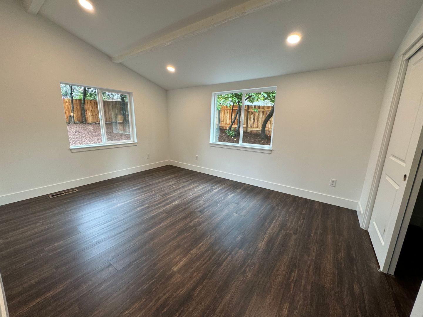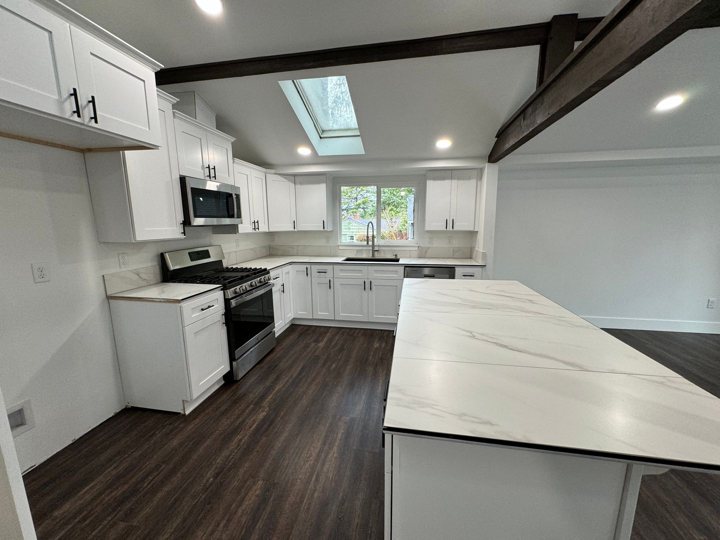 This stunning remodeled single-level home offers 1,330 square feet of comfortable living space with 3 spacious bedrooms and 2 full bathrooms. The open-concept great room floor plan features gorgeous LVP flooring, a ceiling fan, and a dramatic vaulted open-beam ceiling that creates a bright and airy feel. A sliding glass door provides access to the expansive backyard. The island kitchen is fully equipped with a refrigerator, gas stove, built-in microwave, dishwasher, disposal, and skylights that flood the space with natural light. A washer and dryer are also included for added convenience. All bedrooms are generously sized with ample closet space. Step outside to enjoy the huge, fully fenced backyard complete with a deck—ideal for relaxing or entertaining. The home also features a double-car garage for parking and additional storage. Conveniently located with close access to I-5 and HWY 99, this impressive home offers both comfort and accessibility. This is a must-see property! No pets. No Smoking. Drive by and then call 503-526-9311 to schedule a viewing.